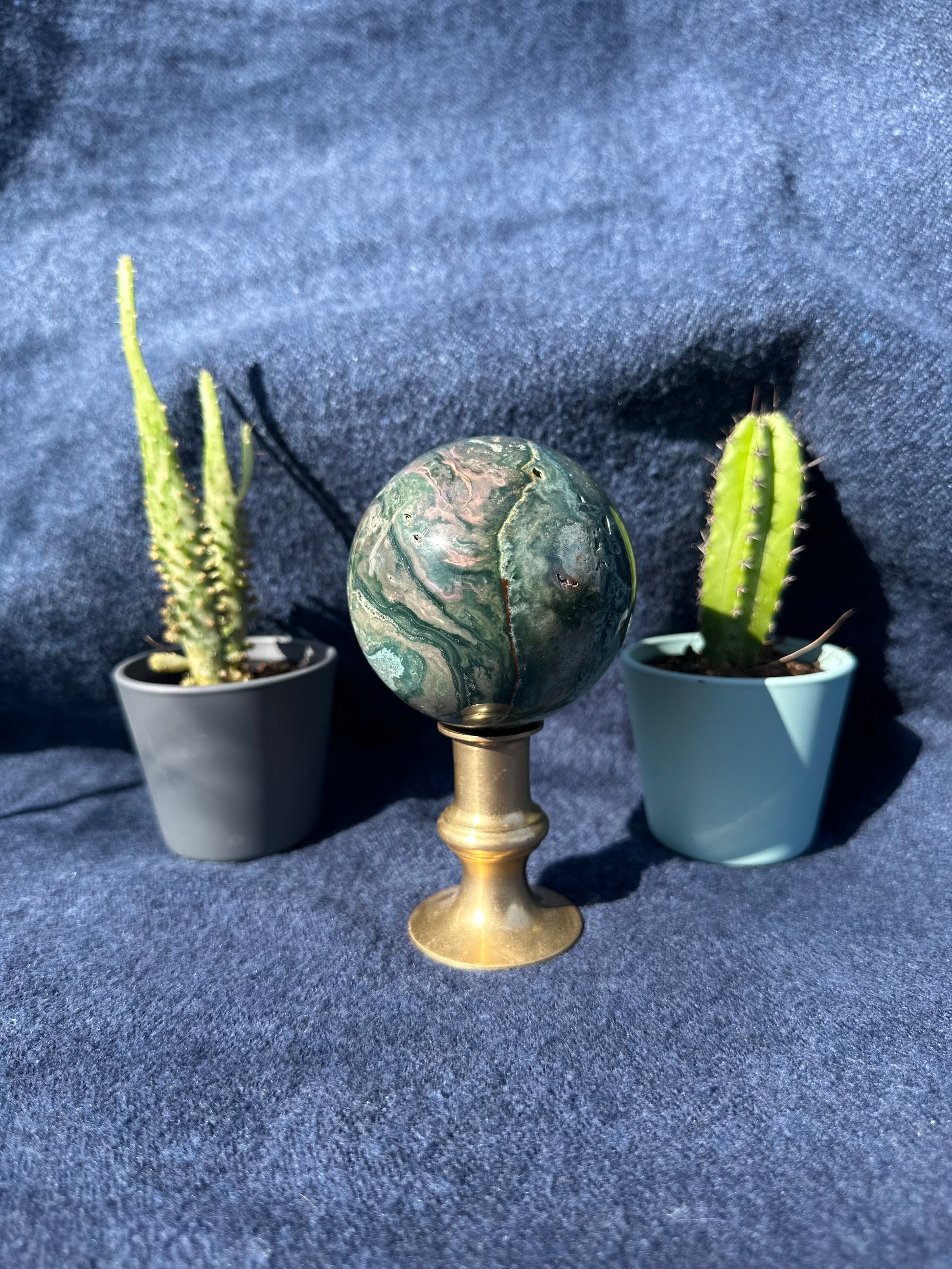 Bring the calming energy of nature into your space with this stunning Moss Agate Crystal Sphere. Measuring approximately 3 inches in diameter and weighing 1.1 lbs, this polished sphere showcases beautiful green inclusions that resemble mossy landscapes—each piece is one-of-a-kind.